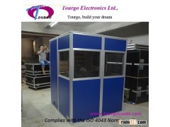 The light weight interpreter booths TG-2LBOOTHS is a light weight, modular, easy to mount interpreter booth for 2 persons, but can be extended for up to 4 persons, using the optional extension sets. 1 or 2 persons can easily build the booth with the included hex key. The TG-2LBOOTHS complies with the ISO 4043 norm for mobile interpreter booths and is equipped with table and 2 cable ducts. Its standard color is light grey, other colors are available on demand.